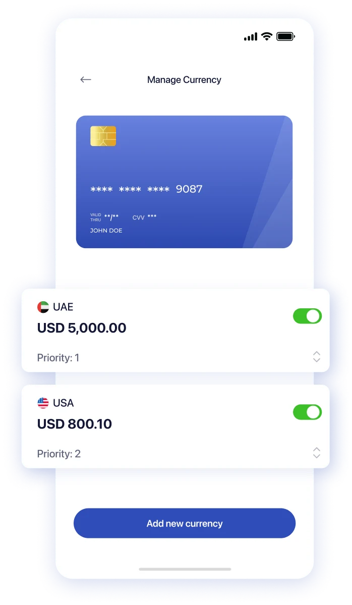 امنح عملاءك حرية السفر، التسوق، والدفع عالميًا باستخدام بطاقة واحدة. يتيح دعم العملات المتعددة مدفوعات سلسة بالعملة المحلية، ويقلل من رسوم التحويل، ويحسّن تجربة الدفع العامة